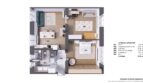 Dispozice tvoří prostorný obývací pokoj s kuchyní na míru v bílém lesku (pracovní deska i parapety jsou z tvrzeného kamene TechniStone), doplněnou o varný ostrůvek, trouba ma pyrolýzu = samočistící funkce trouby, která se zahřeje na cca 500 °C a spálí mastnotu a zbytky jídla na popel, který se pak setře. Koupelna je vybavena dvěma umyvadly, podlahovým vytápěním, velkorysým sprchovým koutem a nadčasově řešenou dlažbou. Samostatné WC navazuje na jednotný styl. V ložnici je k dispozici velká vestavěná šatní skříň s posuvnými zrcadlovými dveřmi.